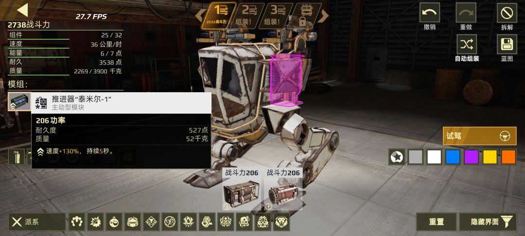 移动端对于部件的组装有能够快速拖动的方便之处,但是也存在着难以精确放置的缺陷。各位工程师可以轻触战车上已装配的部件,根据右下方所选择的转向模式或是移动模式,从而显示半透明的按钮帮助部件进行微调。