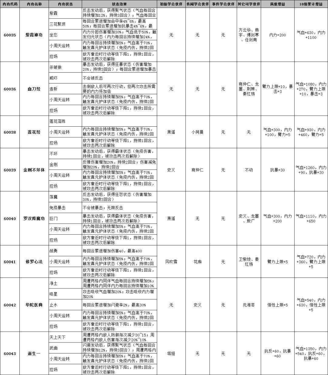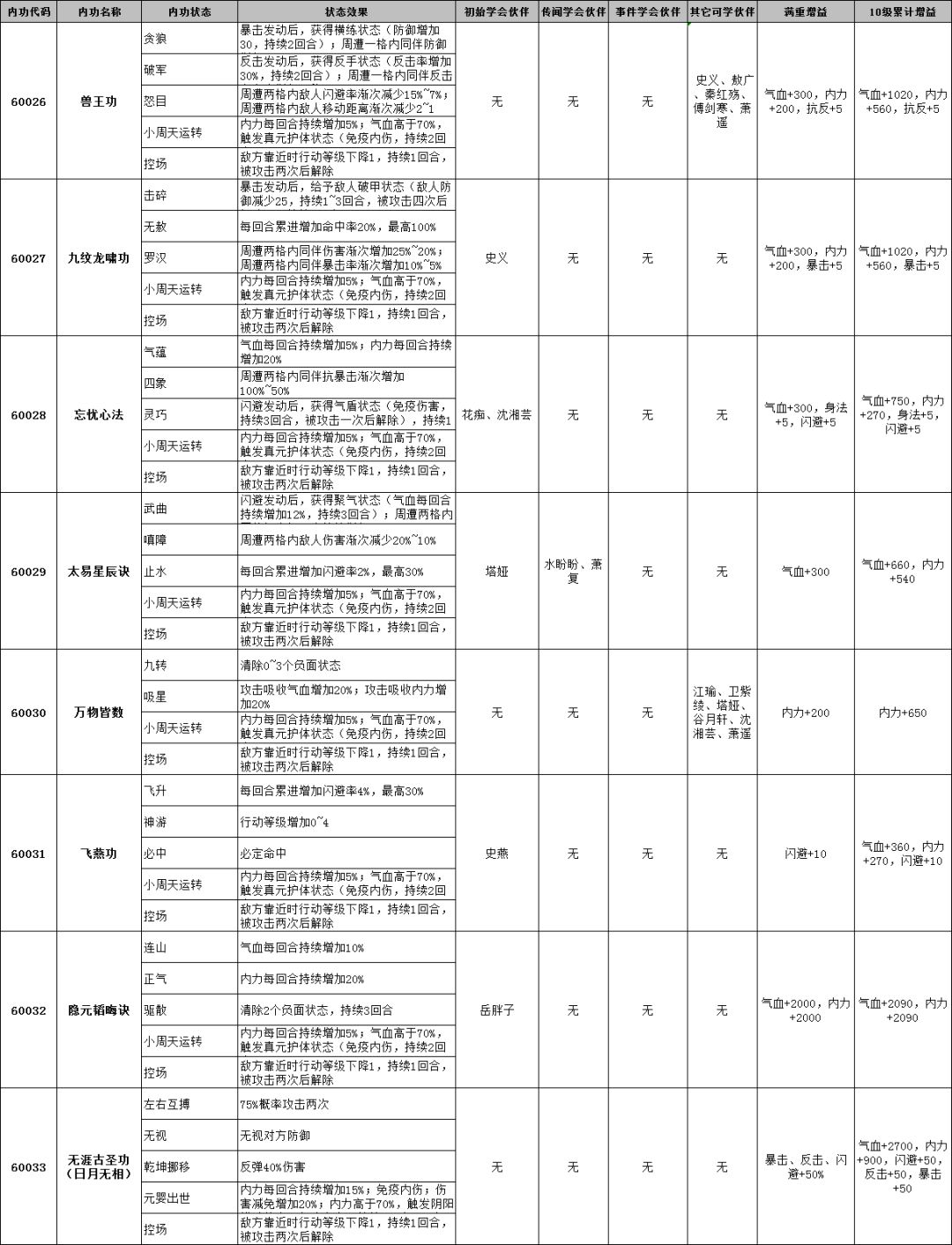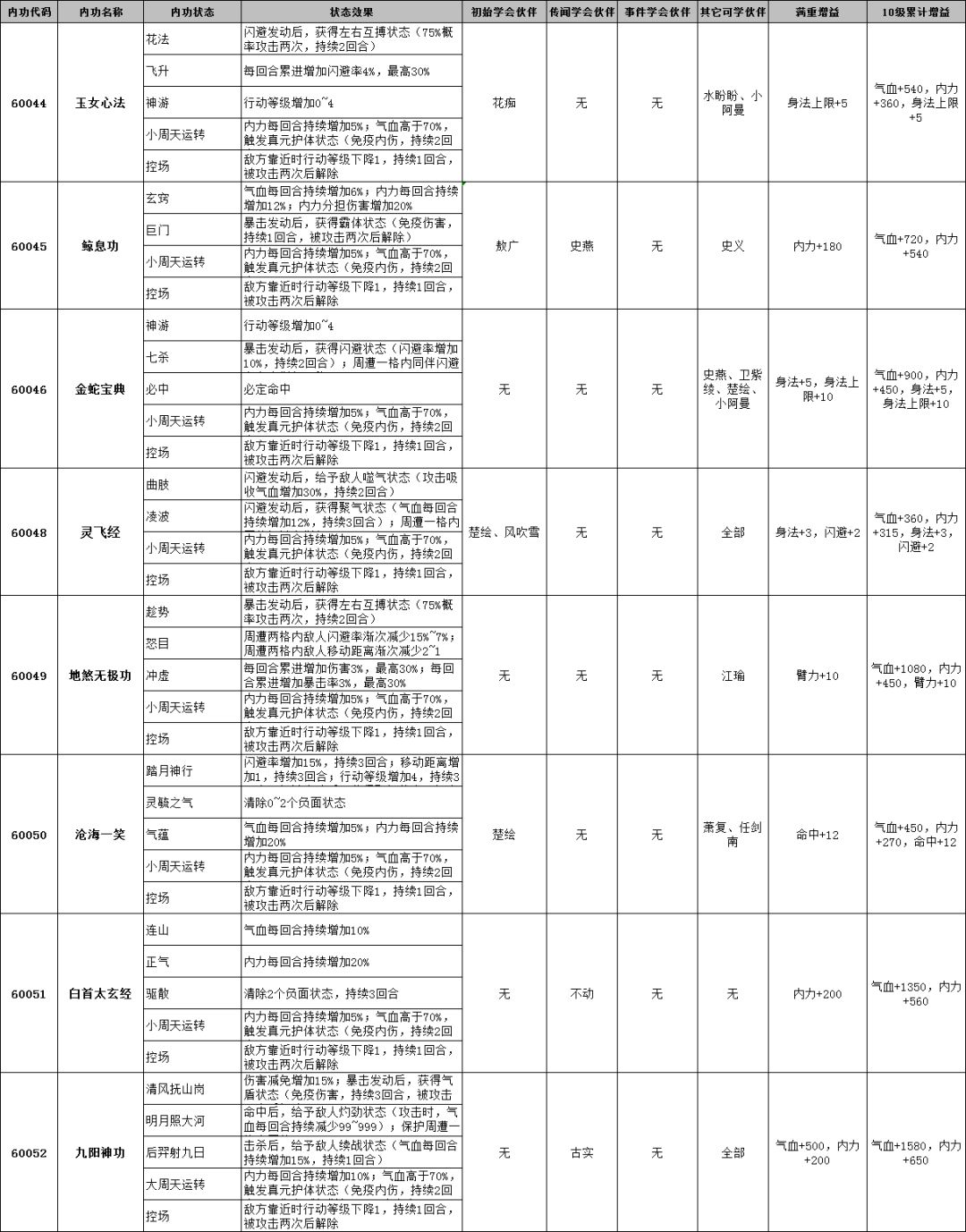 侠客风云传前传内功效果及可学会伙伴一览