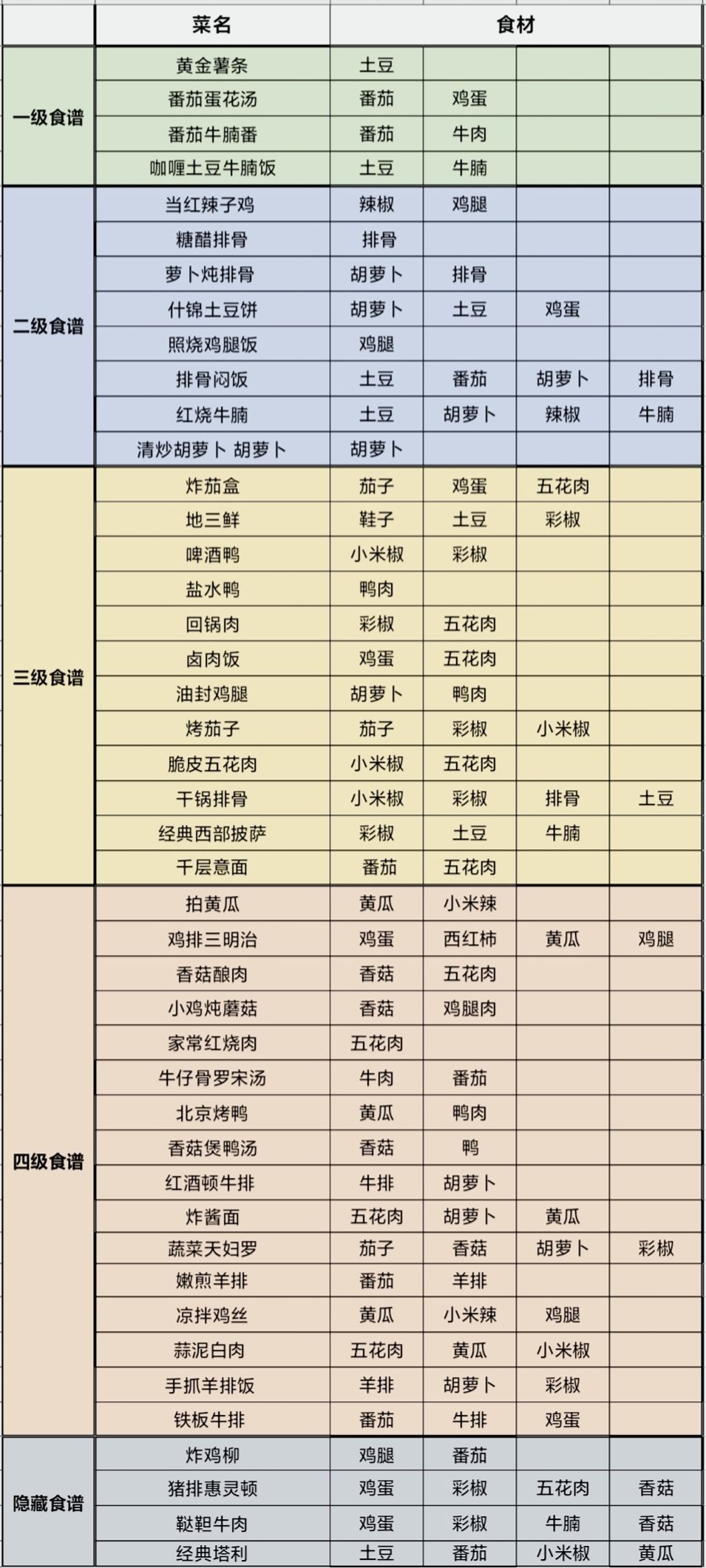 开服不久,还有很多萌新宝子,不知道一些菜品怎么搭配。这里为了方便大家快速简便地查找各类食谱,把分级菜谱、菜名、食材分开放了,希望能够真正的帮助到大家。👍