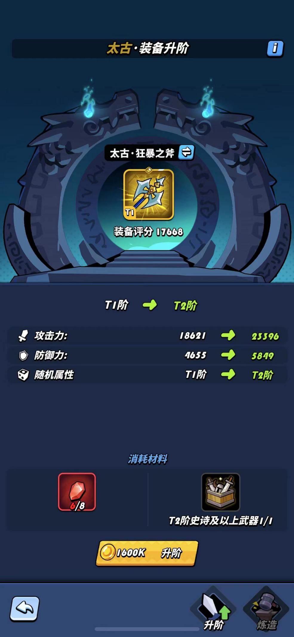有一个小点需要注意,可升阶装备的范围是所有阶太古品质装备以及T1阶装备,每件装备目前只能升阶1次,比如3阶太古装备能升为4阶太古装备,但无法再继续升阶,四阶前太古不推荐升阶。