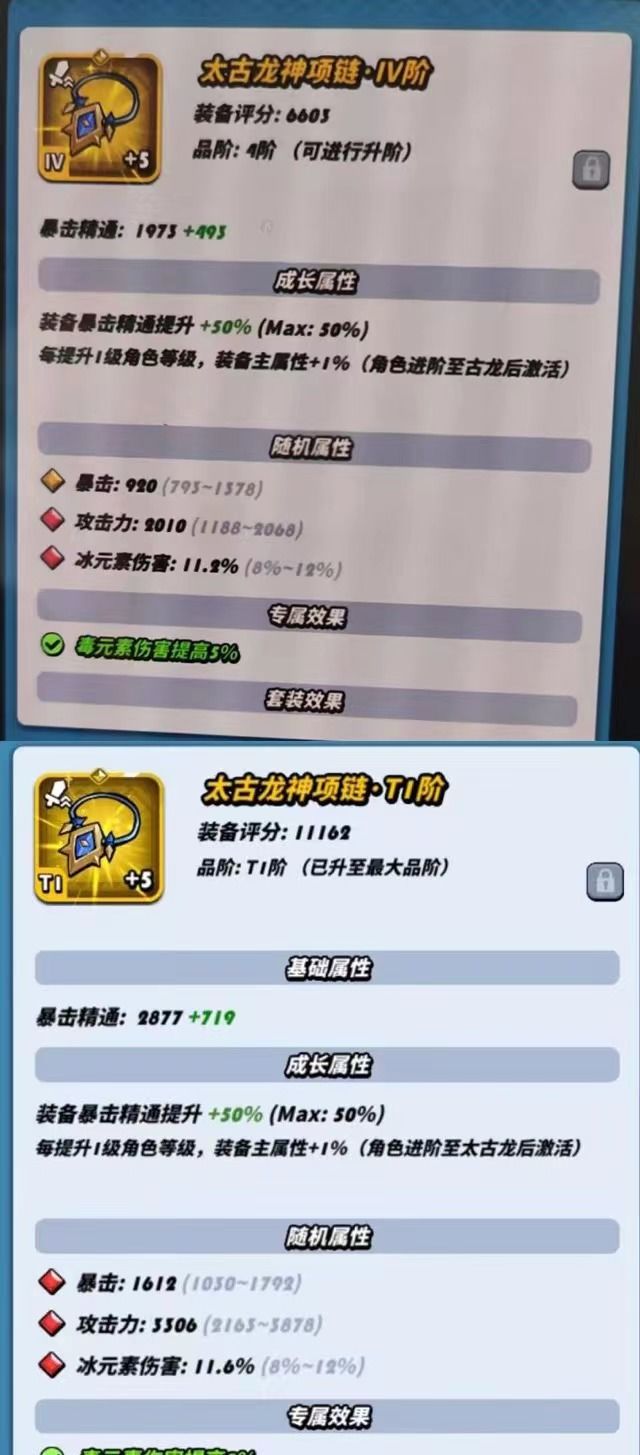 由于太古装备只能装备2件,在你有其对应装备时,武器和项链为最优选,参考装备基础篇里的评分机制,为了保证不浪费材料且有大幅提升,优先考虑对属性词条比较优秀的装备进行升阶。