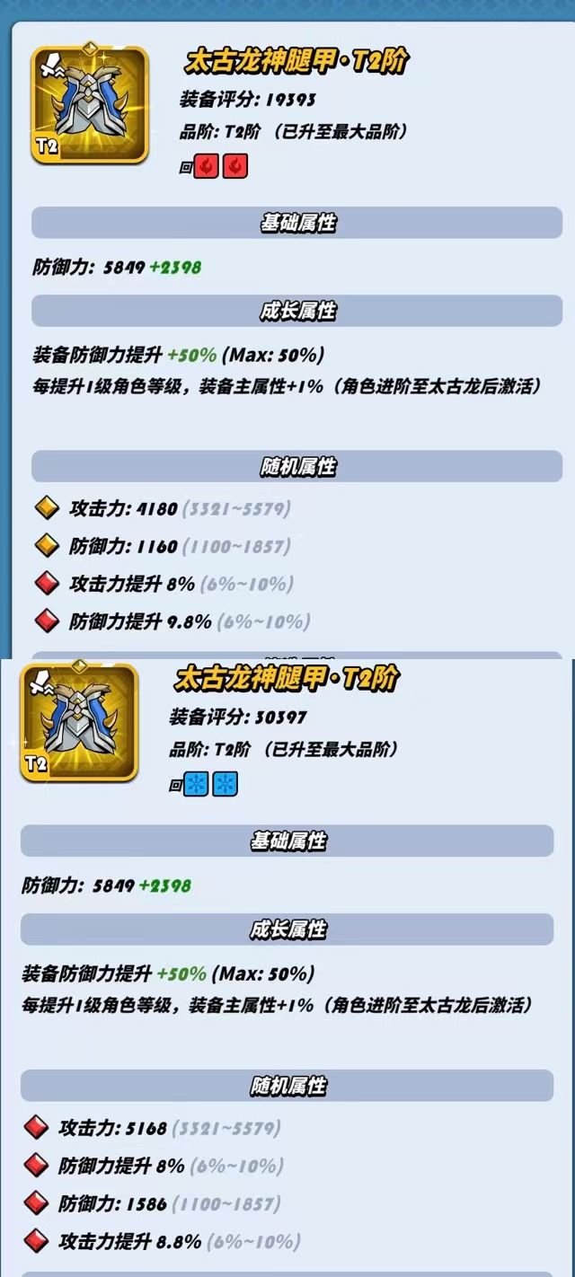 图上原T1阶段上图腿甲属性是高于下图的(尤指攻击百分比),但是我在装备升阶过程中喂养普通史诗装备,而下图是喂养传说装备,在升阶后,副词条属性基本是高于喂养普通史诗装备的腿甲属性。