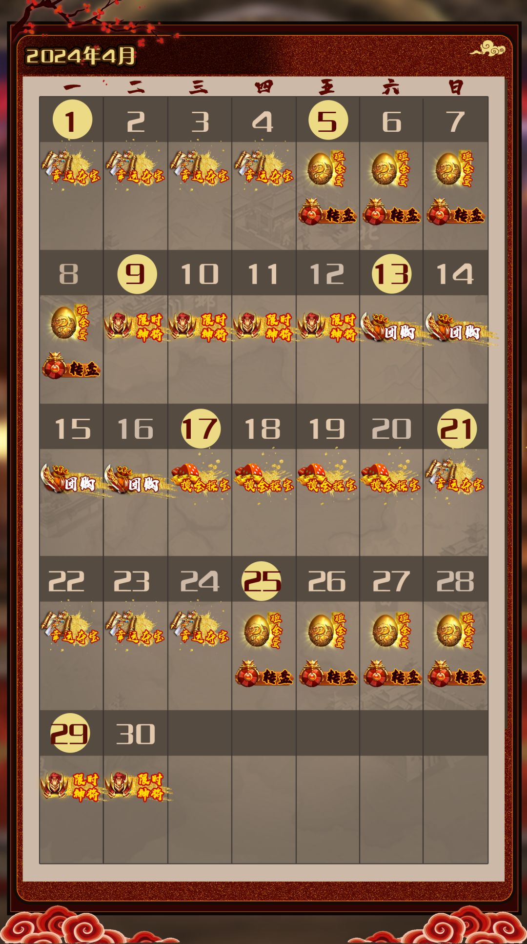 奉上4月活动日历,祝主公武运昌隆。