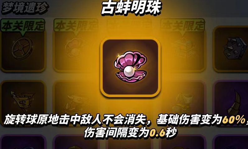 旋转球梦境有一个极其bug的珍宝就是古蚌明珠,旋转球比较让人头疼的一点就是有cd,碰到敌人爆炸后会消失进入一段时间的cd,然而有了这个珍宝之后,只要一直点着屏幕,不要让旋转球飞出去旋转球就可以一直存在,持续造成伤害