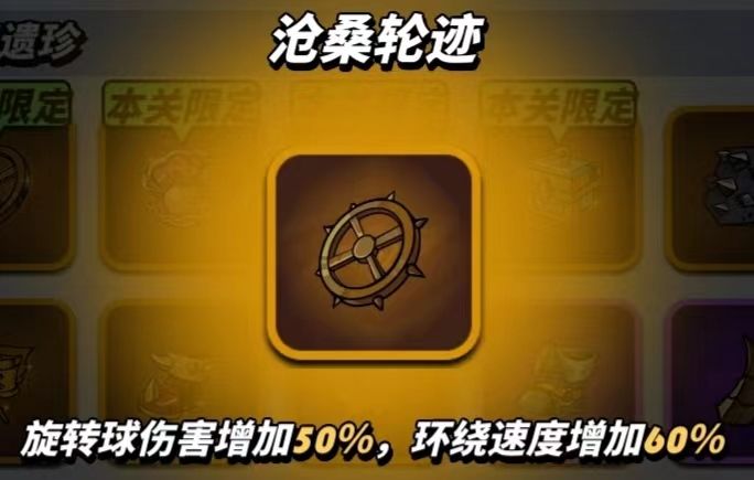 然后就是历史车轴和沧桑轮迹,这两个增加旋转球转速的珍宝实际上是和古蚌明珠相配合的,再古蚌明珠的描述中可以看到伤害间隔是0.6秒,经过测试实际上旋转球转一圈回到原来的位置所需要的时间是大于一秒的,也就是说在旋转球造成伤害后旋转到一半的时候伤害间隔cd就转好了,所以拿到增加旋转球转速后可以让每个旋转球的伤害不间断