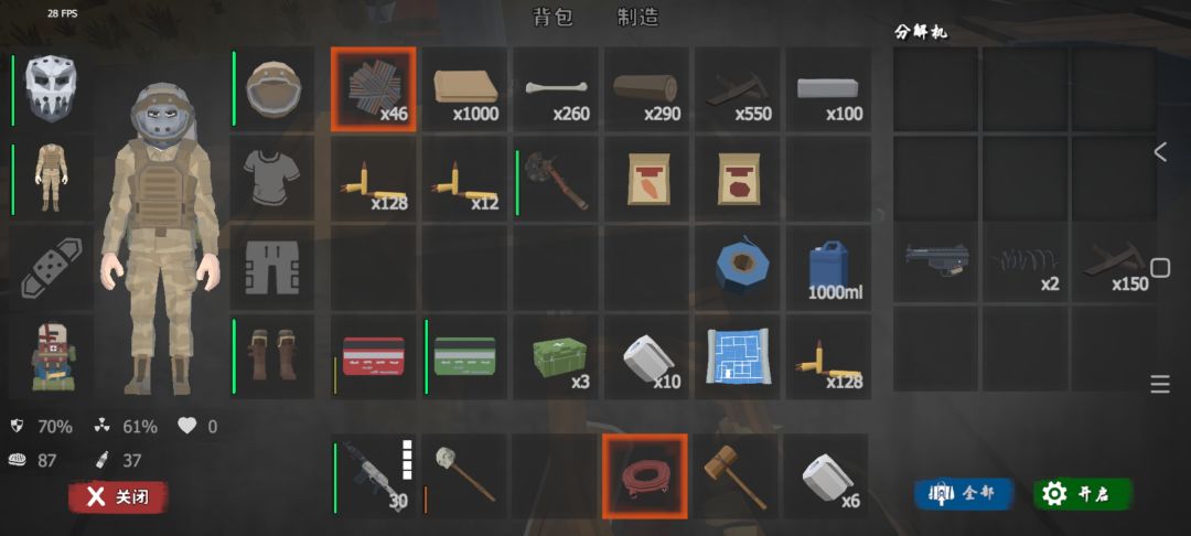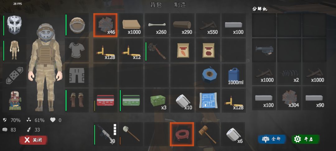 只要不退出游戏,分解可以一直持续,可以获取源源不断的产物,自此,废铁、金属和废料都不缺了。