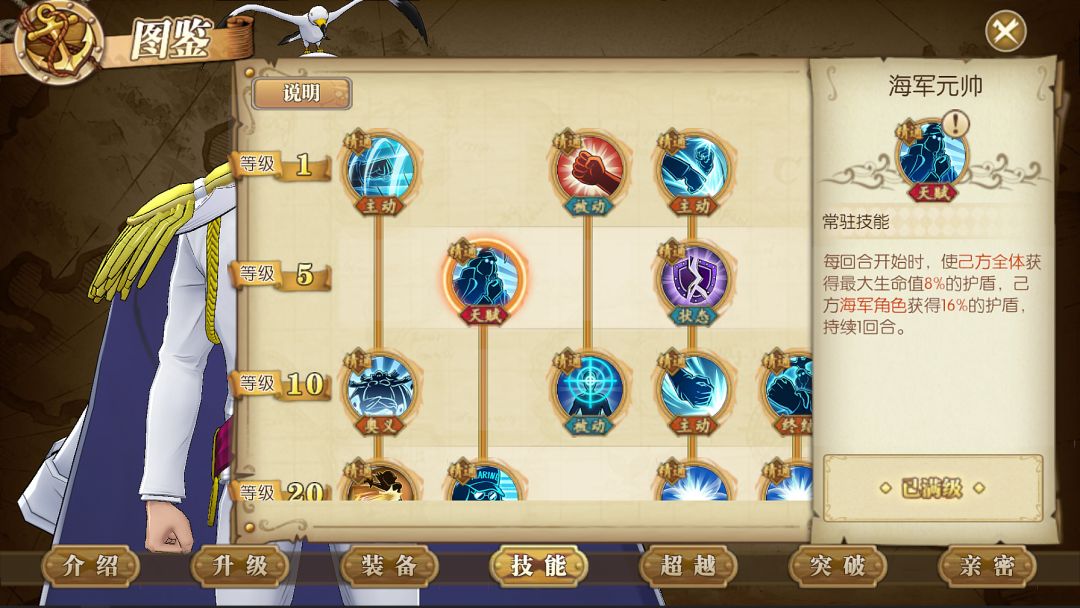海军元帅是战国的核心天赋,这个天赋决定了战国不论是在海军体系还是单挂在其他体系中都可以作为万能挂件,提供每回合稳定护盾且海军护盾量翻倍,而且抽到三星就可以解锁,作为挂件的性价比也很高。但是可能会有船长觉得技能满级百分之8的护盾量不高,但其实这个天赋要配合另一个天赋发挥。
