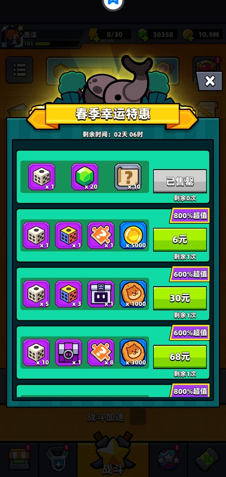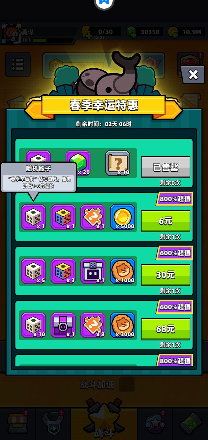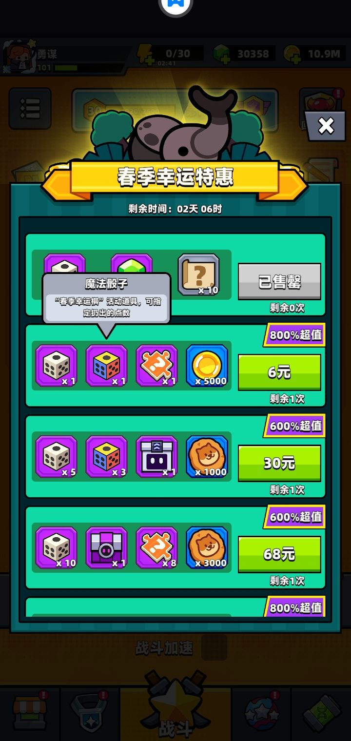 任务尽可能造成,宝箱多开。这个6元的礼包我觉得是最划算的礼包之一了,魔法筛子最适合选择火车或者5随机筛子,6元值2000钻石💎左右,运气好达到4000也可能。