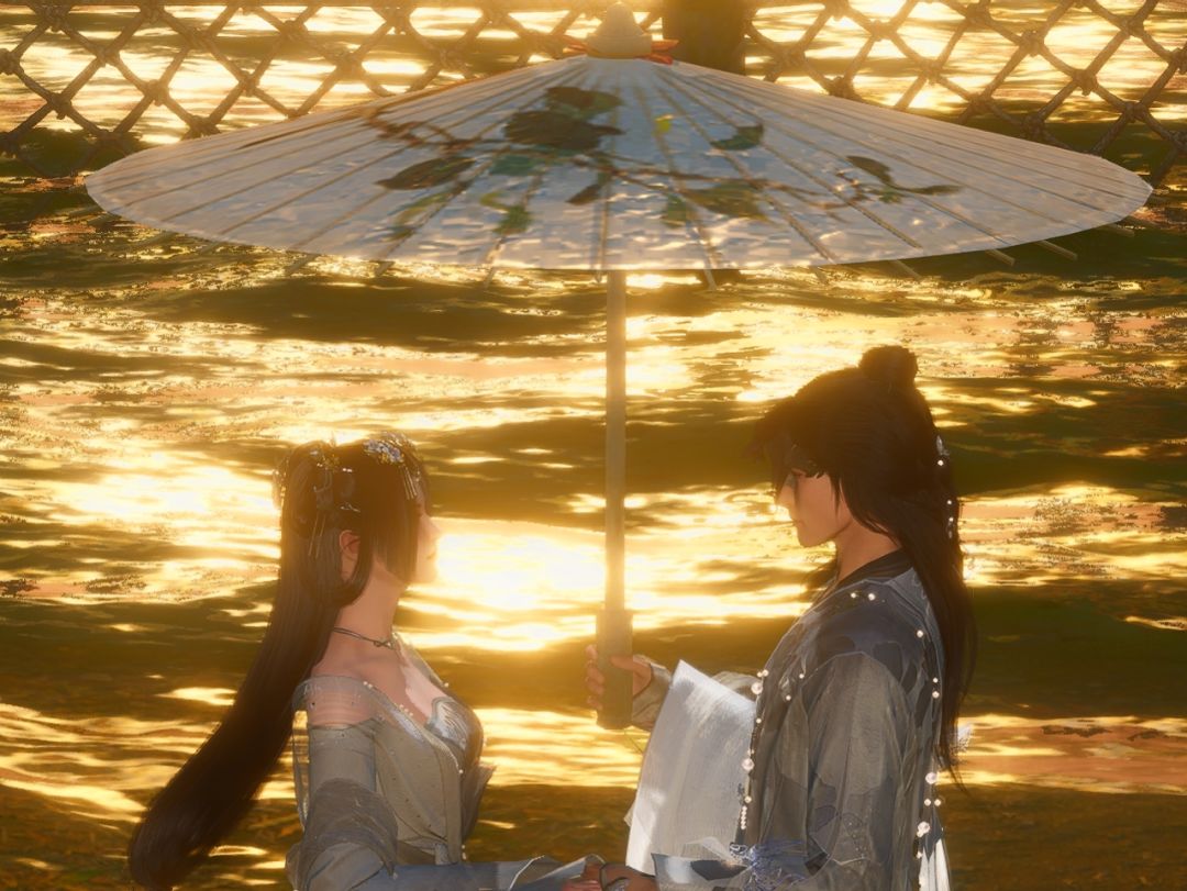 浮波粼粼,点点跃金,旋伞斜举,见君,我心欢喜。