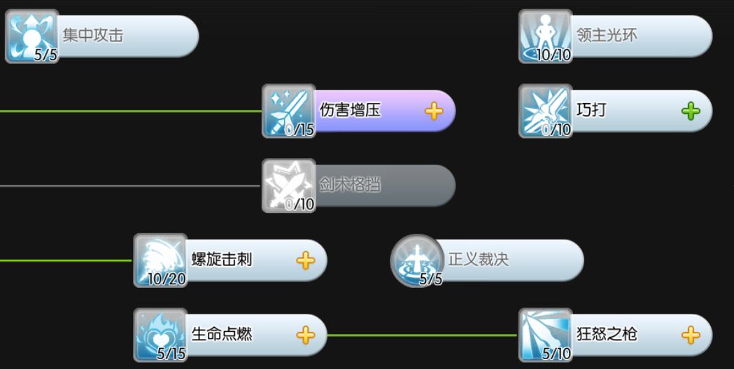 领主光环10、正义裁决5、集中攻击5、螺旋击刺10、生命点燃5、狂怒之枪5
