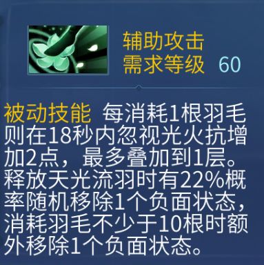 消耗羽毛增加自身忽视光火,释放天光流羽可以解除一个负面效果,消耗不少于10根羽毛时,可以解除两个负面效果。