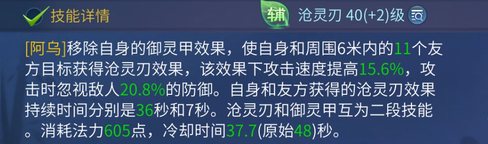 100修天赋技能。释放御灵甲(沧灵刃)后如目标无沧灵刃(御灵甲)效果,则增益时间延长;连香赋的治疗效果提高60%。所以在阿乌状态下不要来回切换甲/刃状态,否则会减少增益时间。