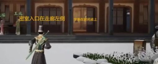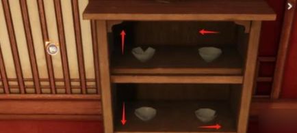 1、前往王二脚店,查看下图桌上的纸条后到走廊尽头的柜子处,有三个有缺口的碗就是密室入口。
