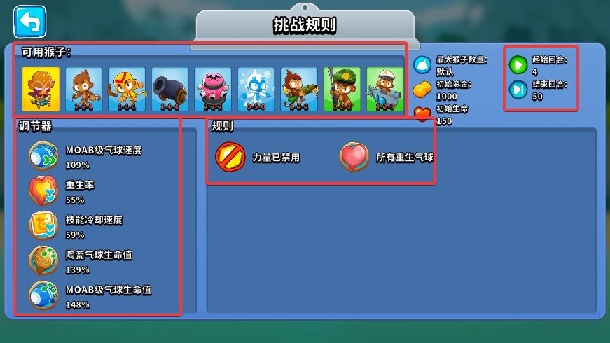 大概的去看一下可以用的猴子以及升级、一共多少个回合、设定的规则以及对于气球的调节,因为这个挑战也有一部分是在考验游戏理解。