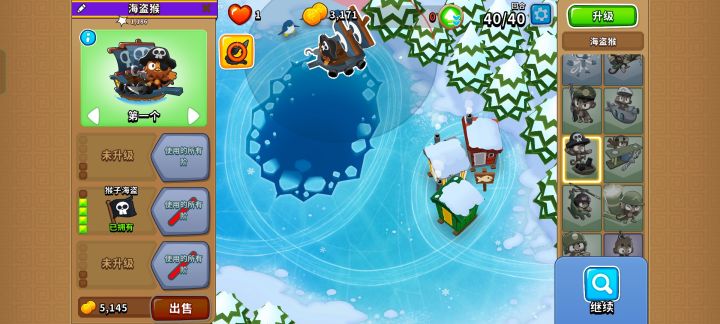 040船,尽量靠上,按技能,比较极限。这次moab爆出的小气球很厉害,所以要在moab被打爆之前抓走moab。