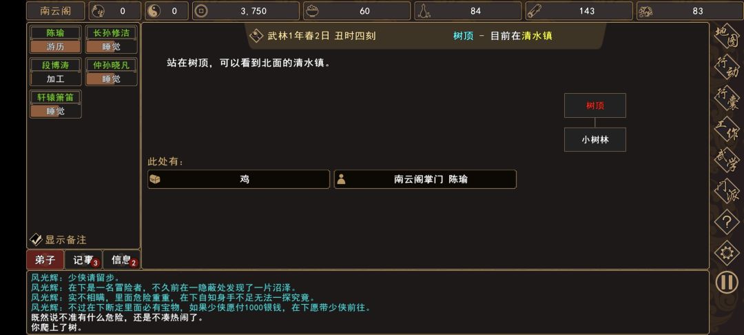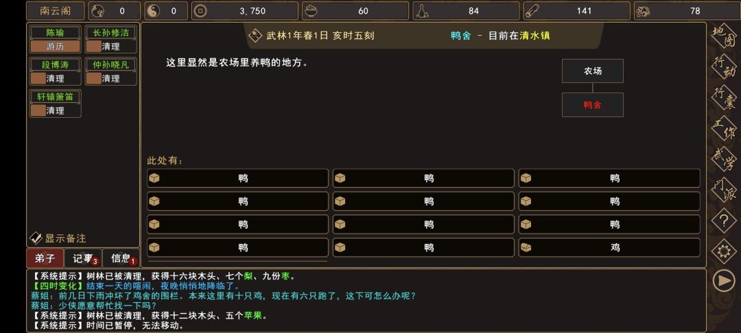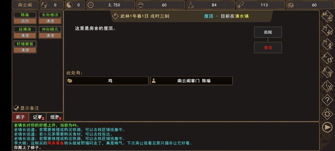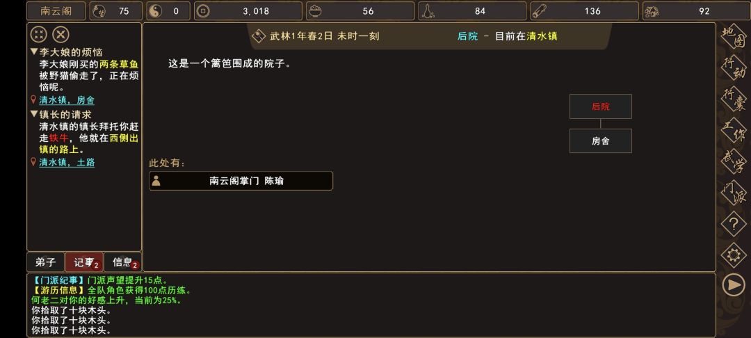(1)清水镇→土路(扬州城外 旁边)触发过场剧情,与[人物:铁牛]和两个小弟战斗胜利后,回到 清水镇→镇长家→[人物:老镇长]对话,解锁任务【建造农庄】和[随机事件:强盗入侵门派],帮忙给谢老头带口信,可以解锁任务【谢老头】。
