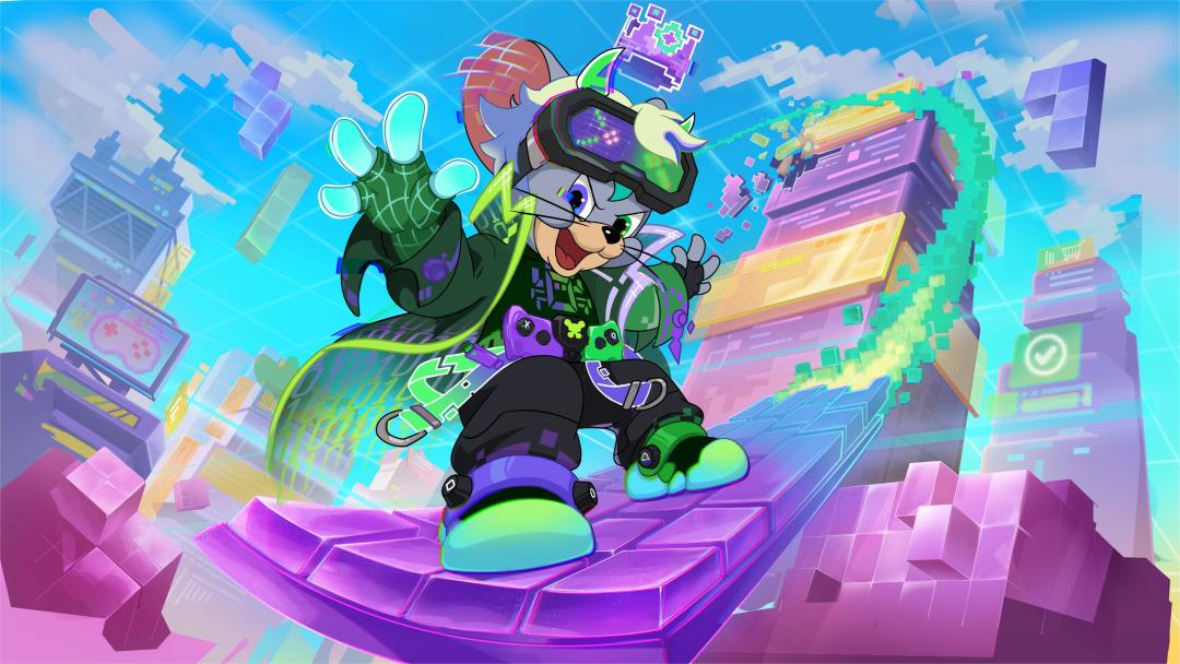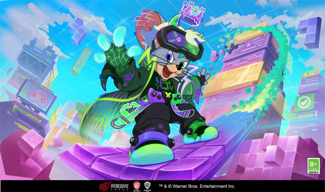 整体风格以电子游戏像素复古的情怀和虚拟世界未来幻想的科技感相结合,色调以蓝绿、青紫为主,增加了经典的俄罗斯方块等元素。