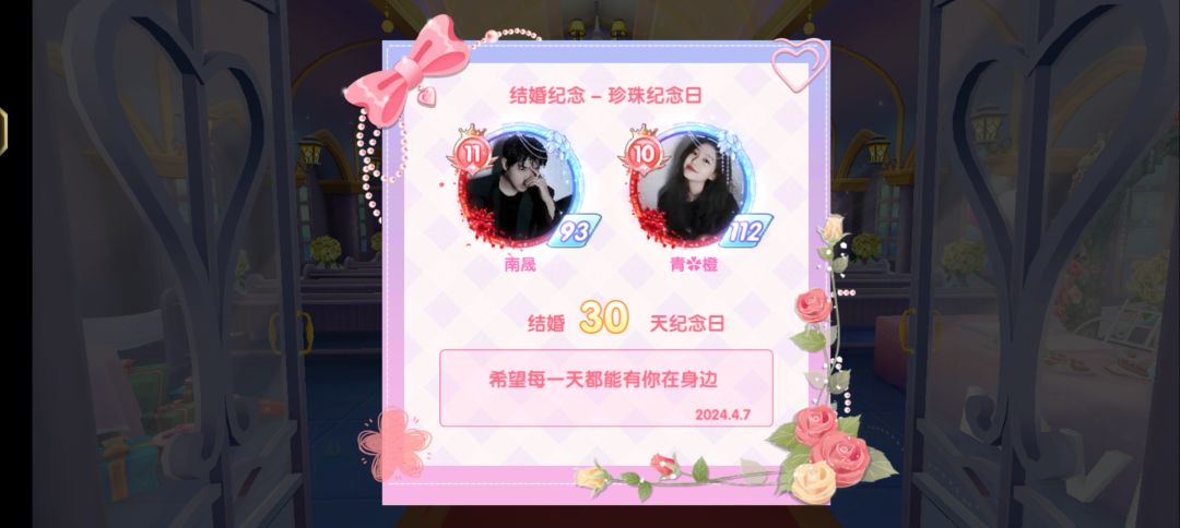 下线后的我期待着第二天的相遇,到了第二天我看见情侣的情标,真好(*^ω^*)你也在。经过一段时间的相处,我对你的称呼也从叫你的游戏名到阿轩、轩,无论我说什么你都会满足我。第一次求婚的婚礼是世纪婚礼,让我觉得我好幸福🥰每天都有你的陪伴,我觉得很幸福。💕💖
