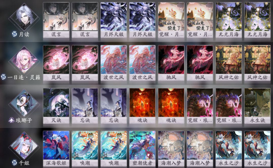 第四人妖琴师能关单核;灵海蝶抗传统快攻;蟹姬、猫武多核心。