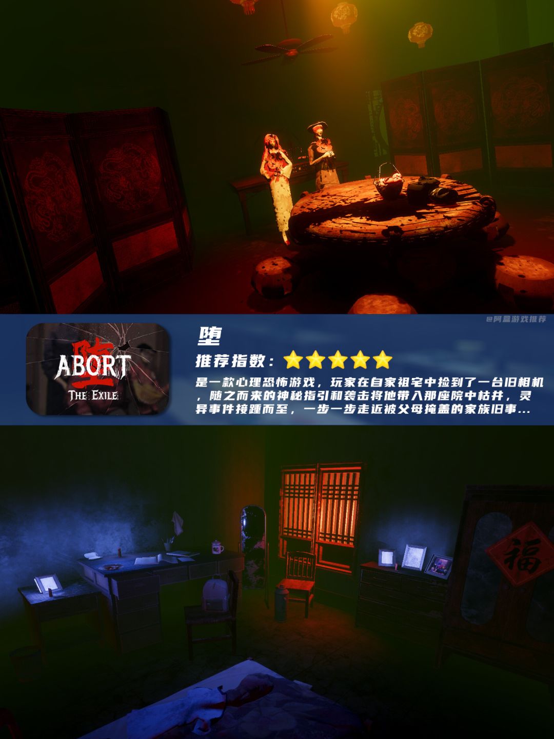 是一款心理恐怖游戏,玩家无意间捡到了一台旧相机,却卷入了种种灵异事件,父母敬拜的神像、陌生的神婆、红嫁衣新娘等