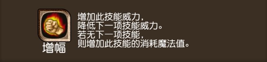 被增幅的技能增加50%伤害,同时下一个技能降低50%伤害,如果这个被增幅的技能是连击中设置的最后一个技能,那么它的蓝耗也会直接增加一倍。