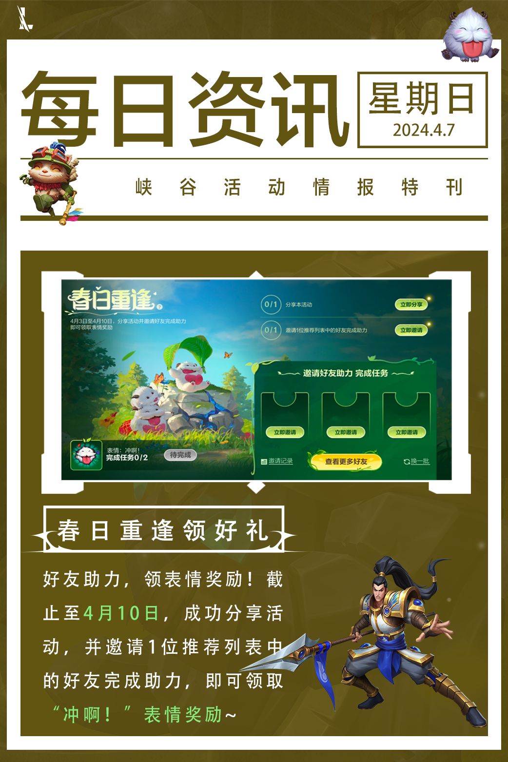 并肩挑战敌人和难题,4月11日让我们和卡莉丝塔一起探索暗影岛的秘密吧~与此同时,欢乐整蛊 累登好礼活动和齐天大圣的金耀试炼活动今日最后一天!还没领取奖励的召唤师记得及时领取,更有诸多福利活动等你参与~