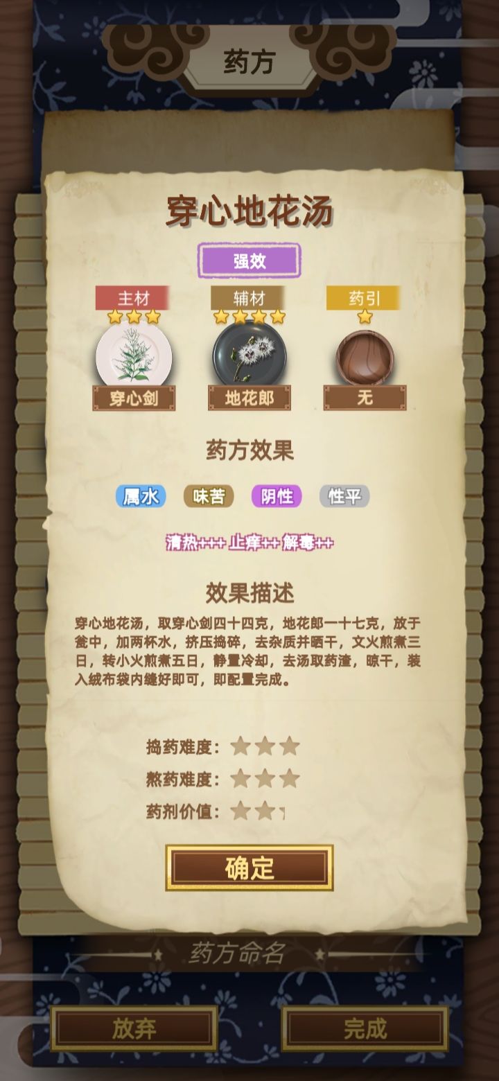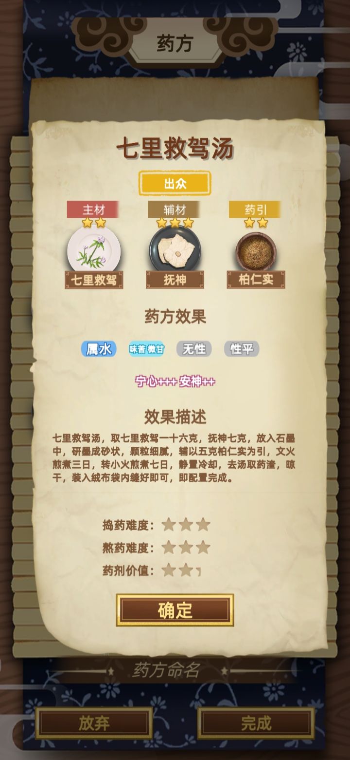 看起来是还算不错的药材组合对吧?今天的病人里只有一个诊断需求“安神+++宁心+++”,其他的病人都需要驱虫(大概他们都捅了虫窝吧?),而你连一个有驱虫效果的药材都没有呢!今天能不能开张就看这张药方了!