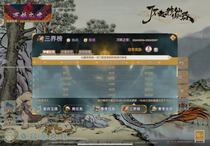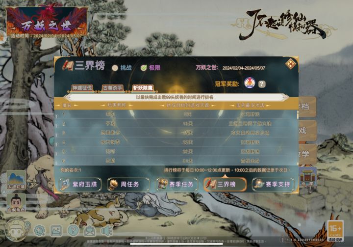 冲榜要求是击杀99头妖兽,如果前三天准备工作做好,极限速度可以四天,快的话五天(我就是五天,刚好超出一秒不然就四天了,拍断大腿),慢也能第六天完成上榜。