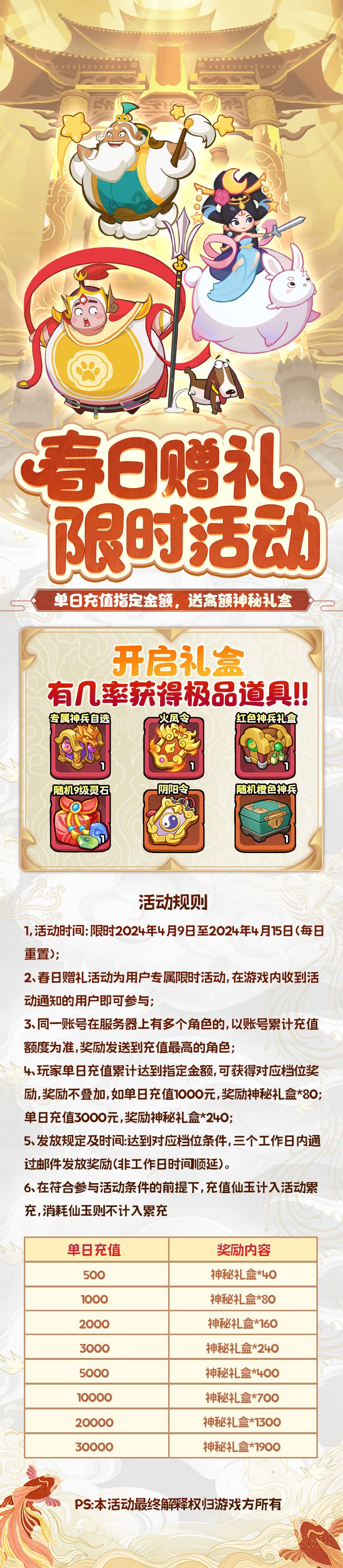②玩家单日充值累计达到指定金额,可获得对应档位奖励,奖励不叠加,如单日充值1000元,奖励神秘礼盒*80;单日充值3000元,奖励神秘礼盒*240;