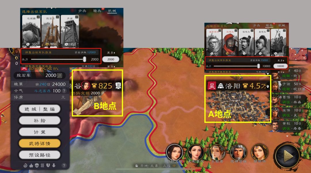 投石车: 投石车最大问题就是在于移动,我们要攻打目的地(C地点),从A地点---------到B地点最近的城府/城池,使用豹骑兵赶路,在B地点整编改为投石车去进攻C地点,技能搭配上选择了“兵贵神速”
