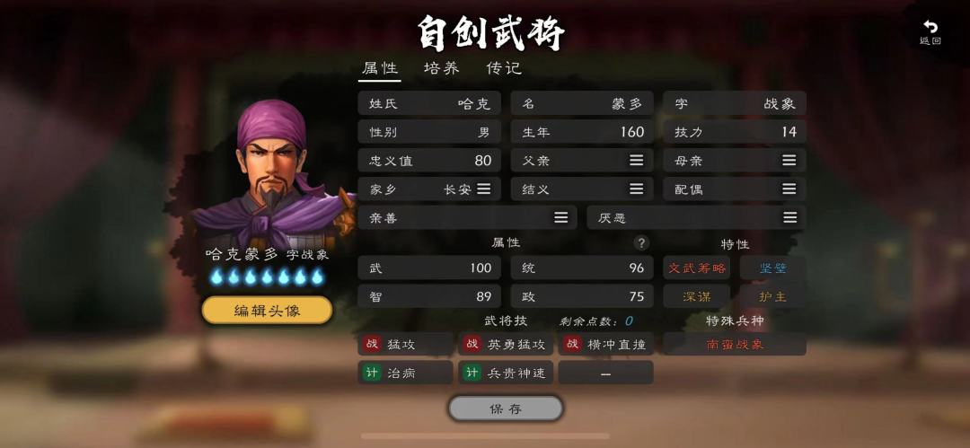 南蛮战象: 皮粗肉厚说的就是战象,特别适合在蜀国地域作战(战象免疫瘴气),在战场中冲锋陷阵往往当作肉盾使用,防御&生命的基础数值都巨高,战象唯一的缺点就是行走特别慢。特性方面我搭配了兵贵神速&护主(自身位于己方君主周围一圈范围内时,使其受到的所有伤害大幅降低;且效果生效时,己方君主不会被俘。) 注:记得把出征的武将设为君主,搭配了护主特性想被击溃都难。