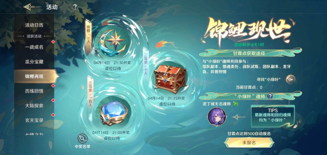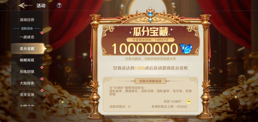 玩家通过和“小绿叶”魂师组队进行游戏活动,获得甘霖点。达到一定数量后可获得瓜分宝藏的资格。获得甘霖点达到1000、2000、3000、5000后,将会提高最后瓜分的奖励档次。