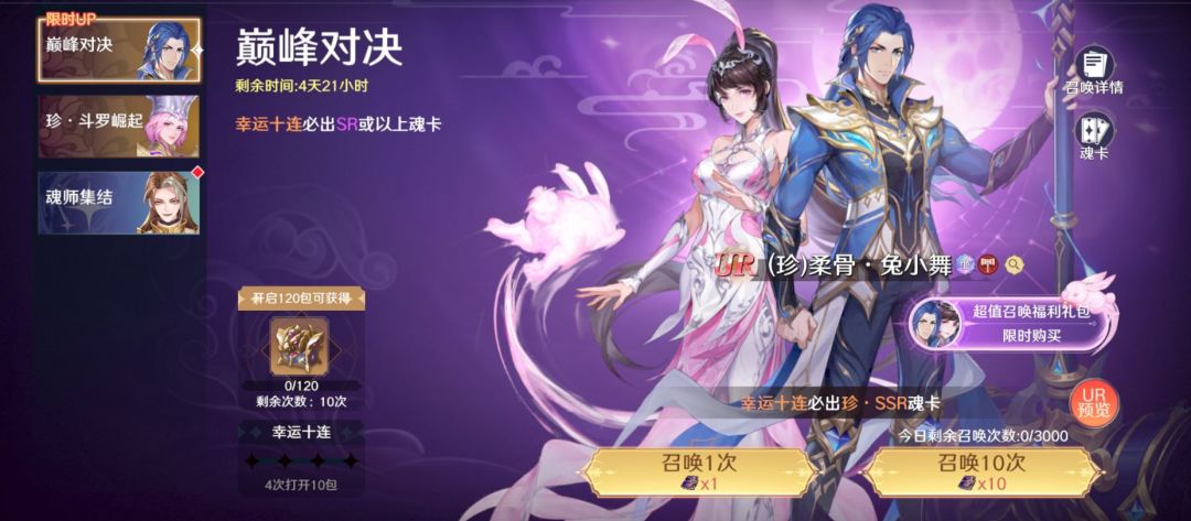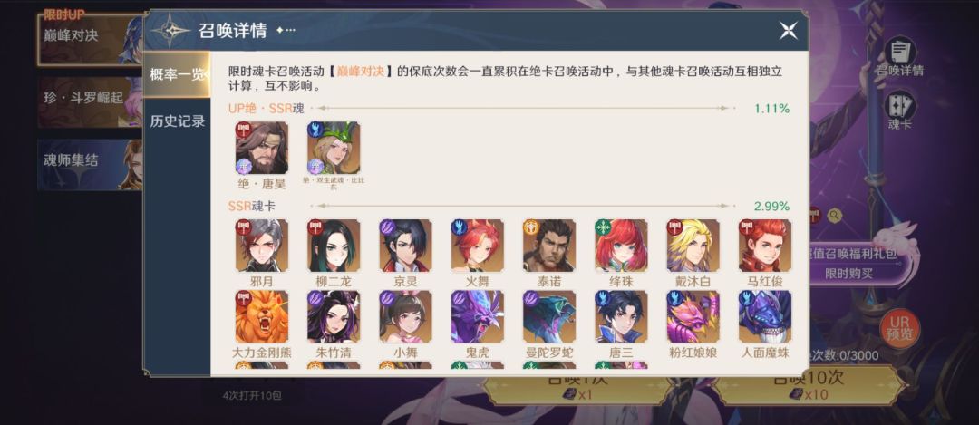 「巅峰对决」限定魂卡UP卡池开启,「绝·唐昊 」 「绝·双生武魂·比比东」SSR魂卡登场、参与玩法活动即可获取,装配实力更上一层楼!!!更有登录馈礼相送:抽卡抽到手软