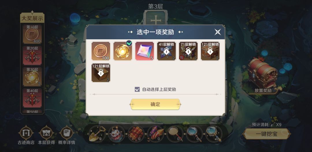 古迹摸金一共200层,每层均可选择一个稀有奖励。每次挖掘可获得一份奖励,当挖掘出每层选定的稀有奖励后,可提前进入下一层,也可停留在本层继续挖掘。摸金达到指定层数,可获得丰厚的放置奖励;并能获得特殊挖掘道具,加快挖掘效率!