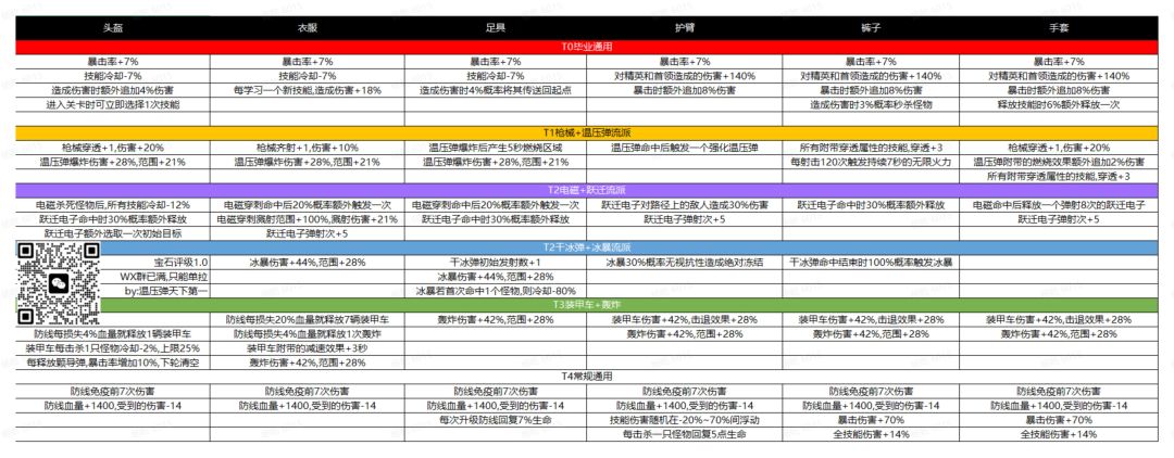 这是“温压弹天下第一”做的宝石推荐。版本也旧了,一直没更新。图太长,T0是毕业通用,T1是枪械+温压弹。宝石效果都是写的至尊级的。有部分宝石是橙色品质开始有,有些是绝世开始有,有些是至尊专属。