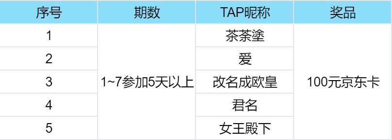 第七期的每日任务挑战获奖名单来啦~![[TapFamily_爱了]](https://img.tapimg.com/market/images/bec74199d492d5d2ad12c434aac536aa.gif)