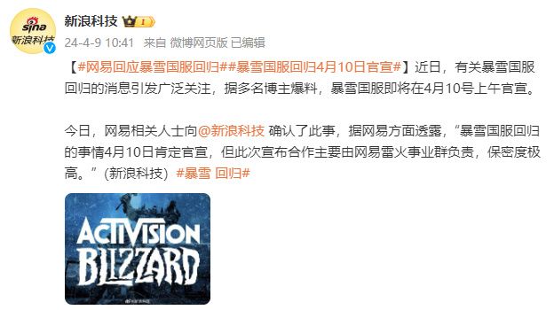 据新浪科技消息,网易相关人士确认,暴雪国服回归将于4月10日官宣,此次宣布合作主要由网易雷火事业群负责。