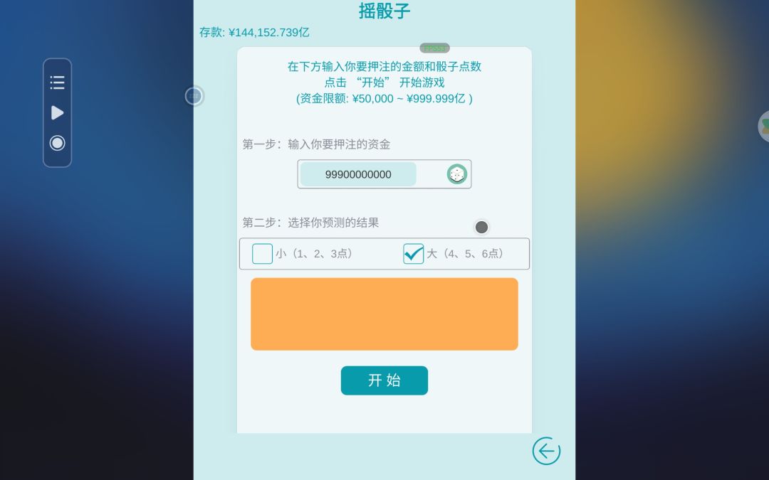 六岁市场功能开放了之后直奔赌场打骰子,我真的要笑死,用17万轻松赢下17万亿家产,自己还是第一代,难道游戏刚开始就要结束了吗?生娃都没生过,剩下的日子我都不知道干嘛了,有没有网友给我支支招😂,不知道有什么好干的了,感觉6岁可以开始养老了。或许可以修仙?有没有大佬有办法的😀