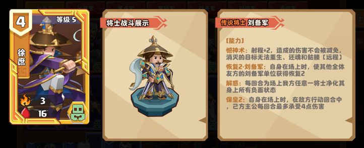 4.当徐庶等级提升到2级后,解锁能力【解惑】:每回合为场上我方任意一将士净化其身上所有负面状态。