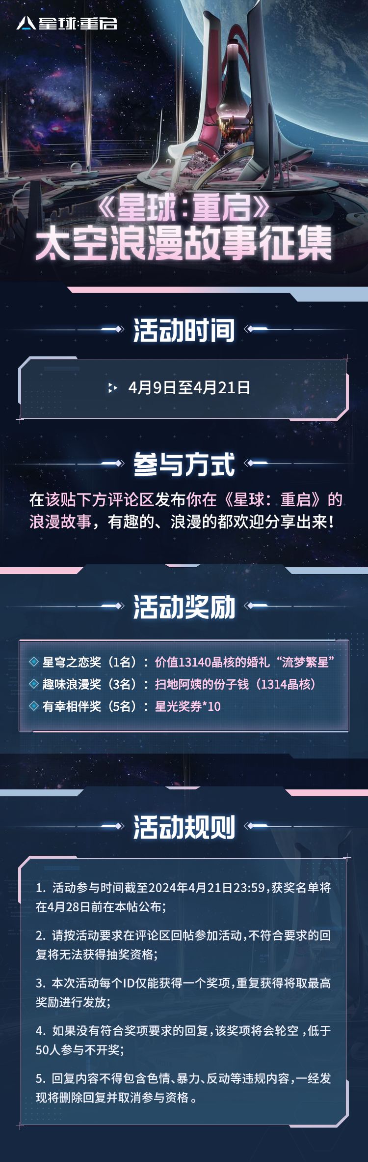 正好婚礼系统即将上线,不如随一个太空婚礼!来评论区分享在星球上与TA的浪漫故事,就有机会领到扫地阿姨为你们准备的“流梦繁星”婚礼、1314晶核礼金哦~