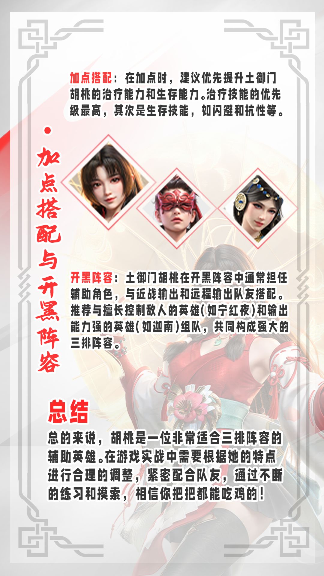 2、开黑阵容:土御门胡桃在开黑阵容中通常担任辅助角色,与近战输出和远程输出队友搭配。推荐与擅长控制敌人的英雄(如宁红夜)和输出能力强的英雄(如迦南)组队,共同构成强大的三排阵容。