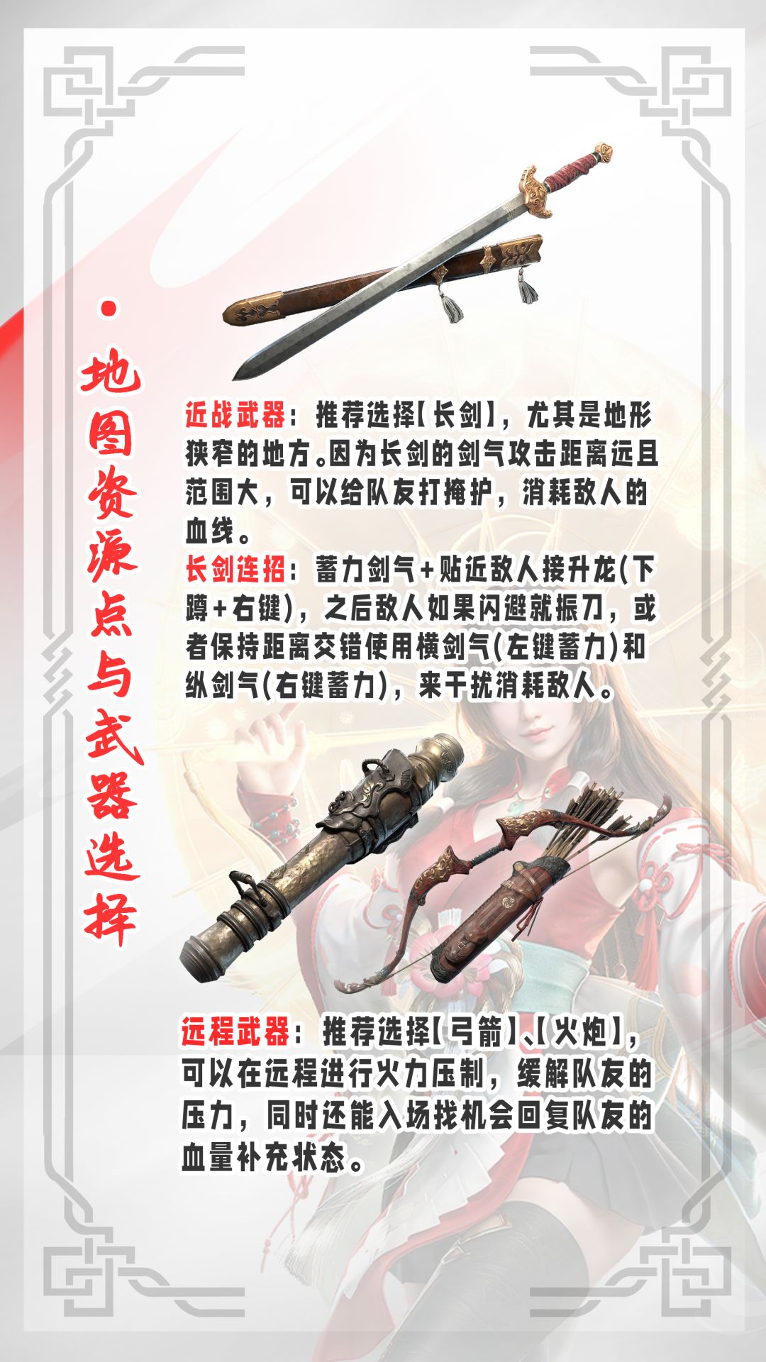 (1)近战武器:推荐选择【长剑】,尤其是地形狭窄的地方。因为长剑的剑气攻击距离远且范围大,可以给队友打掩护,消耗敌人的血线。