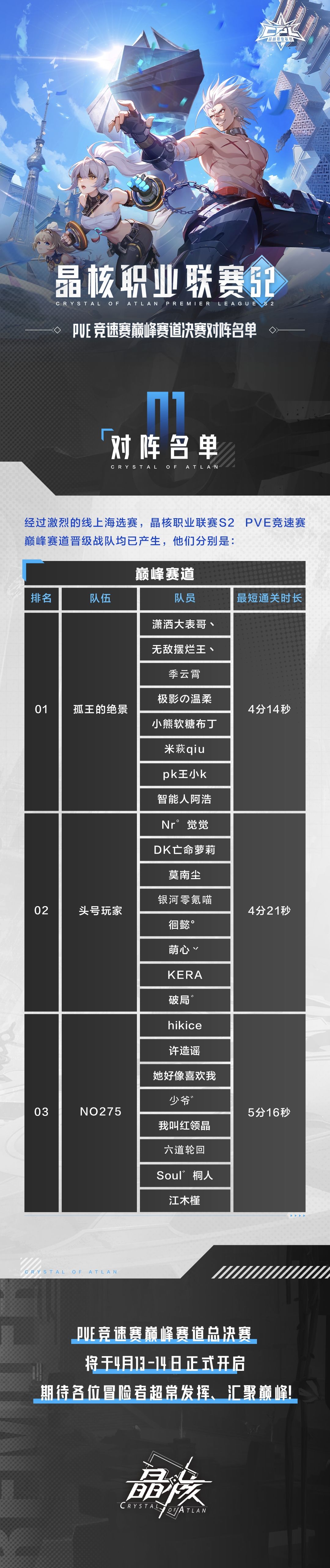 晶核职业联赛S2丨顶峰相见!PVE竞速赛巅峰赛道决赛对阵名单公示