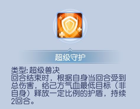 这个技能偏向于血耐宠物,在回合结束时释放护盾给气血最低的目标,但个人认为利用率不高且不太划算。震慑类型的宠物可以考虑选择这个技能~