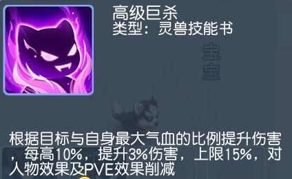 巨杀技能是目标最大气血/自身最大气血的比值越大,则自身伤害越高,每个目标单独判断。即目标血越多,自己血越少,伤害越高。推荐全输出宝宝或敏攻宝宝,比如蛟公子、剑魔、枪仙。