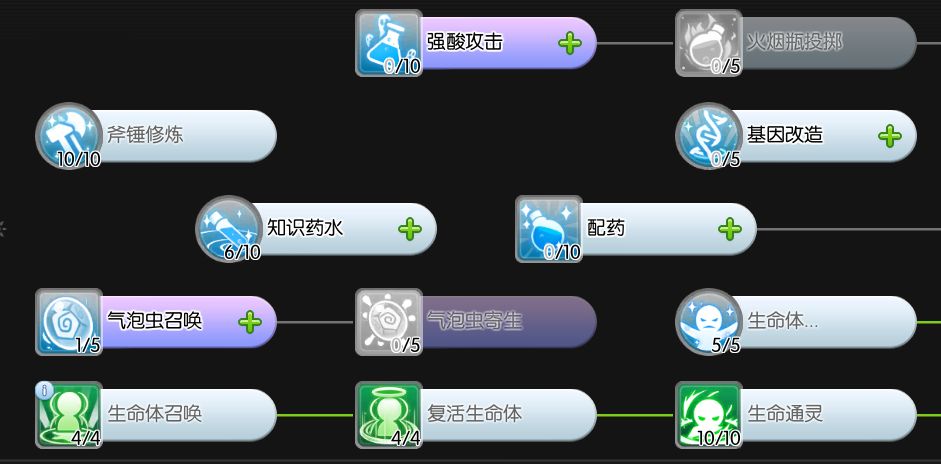 斧锤修炼10、知识药水6、生命体召唤4、生命体复活4、生命通灵10、生命强化5、气泡虫召唤1