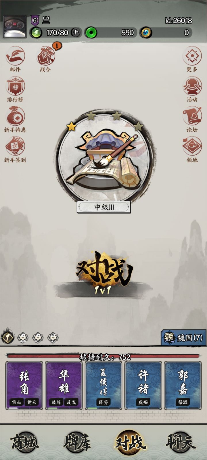 玩法:刚开始先出华雄与夏侯,许褚血薄之后再出,最简单的方法就是先用张角、郭嘉消耗离华雄最近的敌方单位,再由夏侯附近的华雄一刀秒杀,就算秒不掉也是残血状态等下一回合由张角收尾即可,然后让华雄夏侯许褚逐步推进,简简单单就上了中级段位。