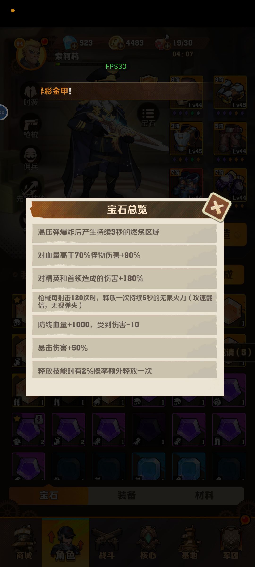 再说宝石搭配 首先暴击率 因为升级技能加爆伤 爆伤会很高 所以暴击收益最高 其次是枪伤 物伤 冷却 齐射 穿透 精首伤害宝石最好带两个 回血带一个 有工程师后可以下回血 前期多带血量宝石 后期下血量多带免疫次数 比较核心的是鞋子的燃烧区域和传送 裤子的秒杀和所有穿透 手套的所有穿透