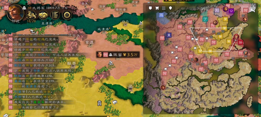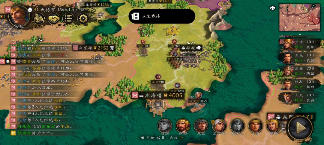 第三步:打黄孔,灰色刘,孙,这个"打"是可以同时打好几个城的,大于80武值都给他派上战场,我最高同时出征30多个,曹老板的武将·····5个包一个城