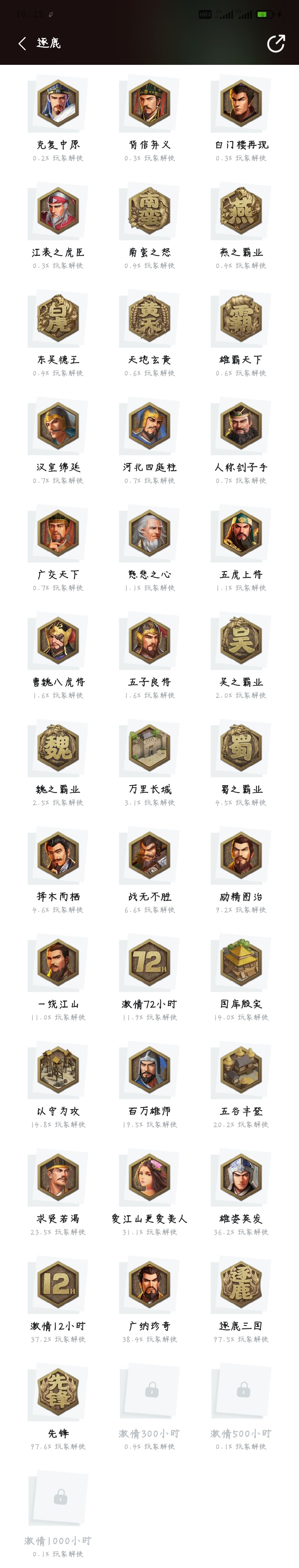 最后提一下整体的时间顺序,开局占城,2+1,(存主档1后做一下解盟结盟-期间存2档,做完,读主档1继续)基础设施建满开战,灭势力看俘虏,存主档1,回档做成就(期间存2档),基本上最后打到马超,灭马超,释放需要的武将,派亲信登庸,集齐武将存档1,存主档后建未央宫,(期间建其他资源成就,)未央宫完成前一旬(存2档),挨个继位做成就,然后五个完成,存档继位挨个灭士燮,完成31个成就。